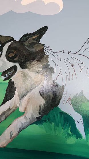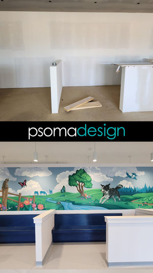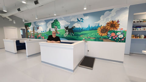 This mural was designed and painted in 2024 for the brand new Gobles Veterinary Clinic. Photos are from phase one of the project, and I'll be completing a few more smaller murals this fall/winter. The whimsical nature and color palette are a warm welcome to patrons and their pets as they enter the building into the main waiting room area. My assistant artist for this project was Elena Phillips.