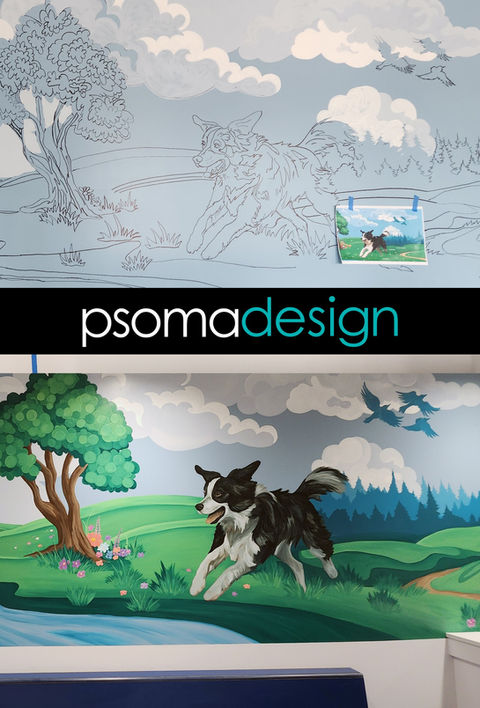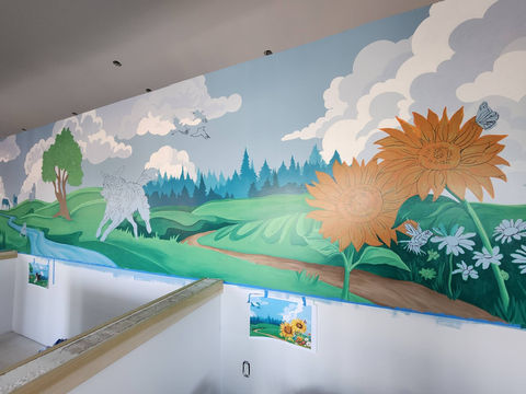 This mural was designed and painted in 2024 for the brand new Gobles Veterinary Clinic. The whimsical nature and color palette are a warm welcome to patrons and their pets as they enter the building into the main waiting room area. My assistant artist for this project was Elena Phillips.