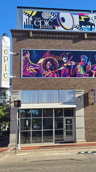 In 2025 was selected as the winning artist for two murals on the Epic Center Building in downtown Kalamazoo. The first mural is a single panel measuring 33.6 x 8.5ft. The second is a series of 4 panels that wrap around a window on the end of the building measuring 15 x 16.25ft. These were digital murals, which were printed on vinyl and installed onto the building in September of 2025.